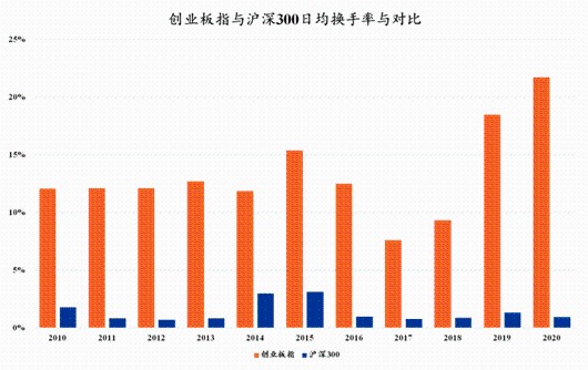 沪深300十年来的日均换手率都不超过5%,而创业板指的日均换手率高出不少,基本都在8%-15%,甚至今年以来的换手率达到了20%。