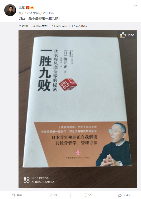 此前雷军在读日本首富柳井正的《一胜九败:优衣库风靡全球的秘密》一书,讲的是优衣库的成功之道,创业这条路不好走,现在看到的成功者,背后往往有一大批创业失败的人,只不过大家因为幸存者效应,不去关注那些失败的人而已。