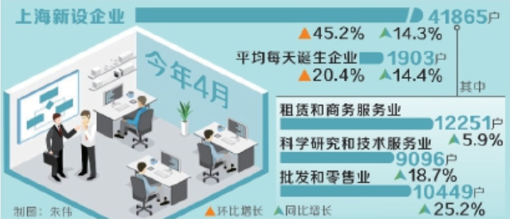 来自上海市市场监管局的数据显示,今年4月,上海新设企业41865户,环比增长45.2%,同比增长14.3%;平均每天诞生1903户企业,环比增长20.4%,同比增长14.4%。