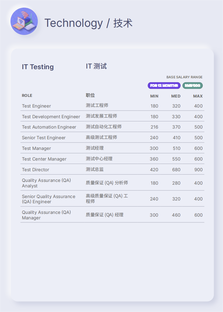 软件测试工程师的薪资略低于开发岗位。测试相关管理岗位的薪资基本与同级开发管理岗持平。