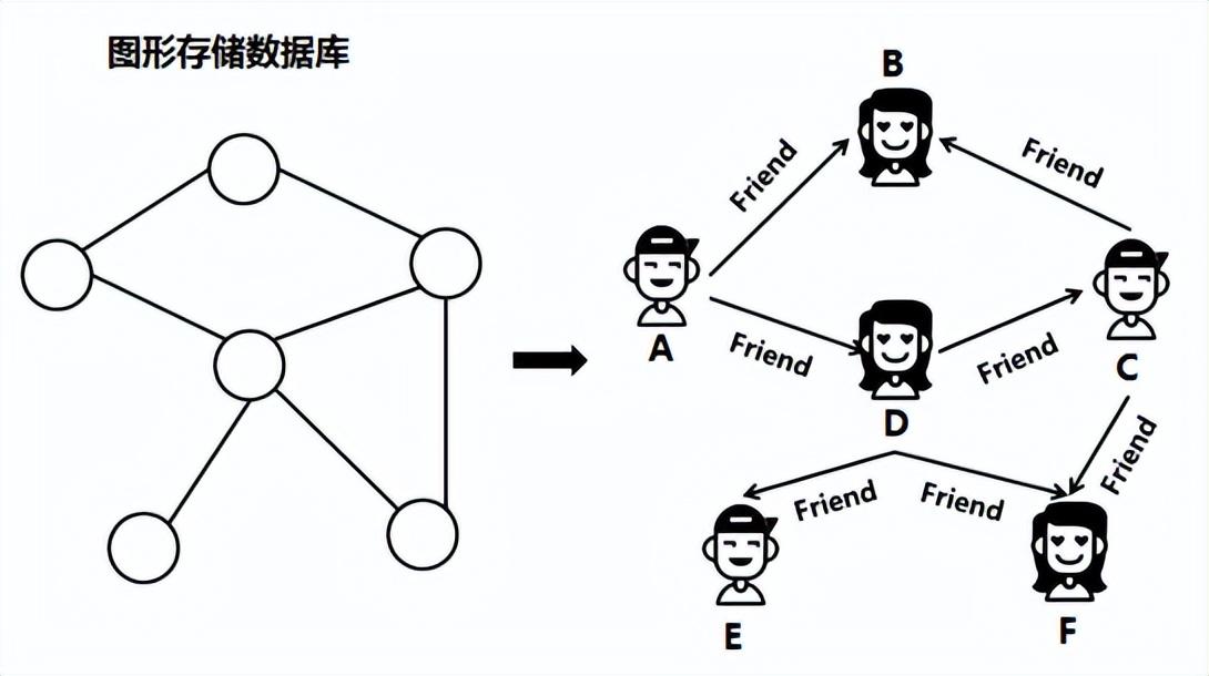 利用图形存储数据库存储的数据,可以很清晰知道两个实体之间的关系,即A和D是朋友,C是A朋友的朋友。
