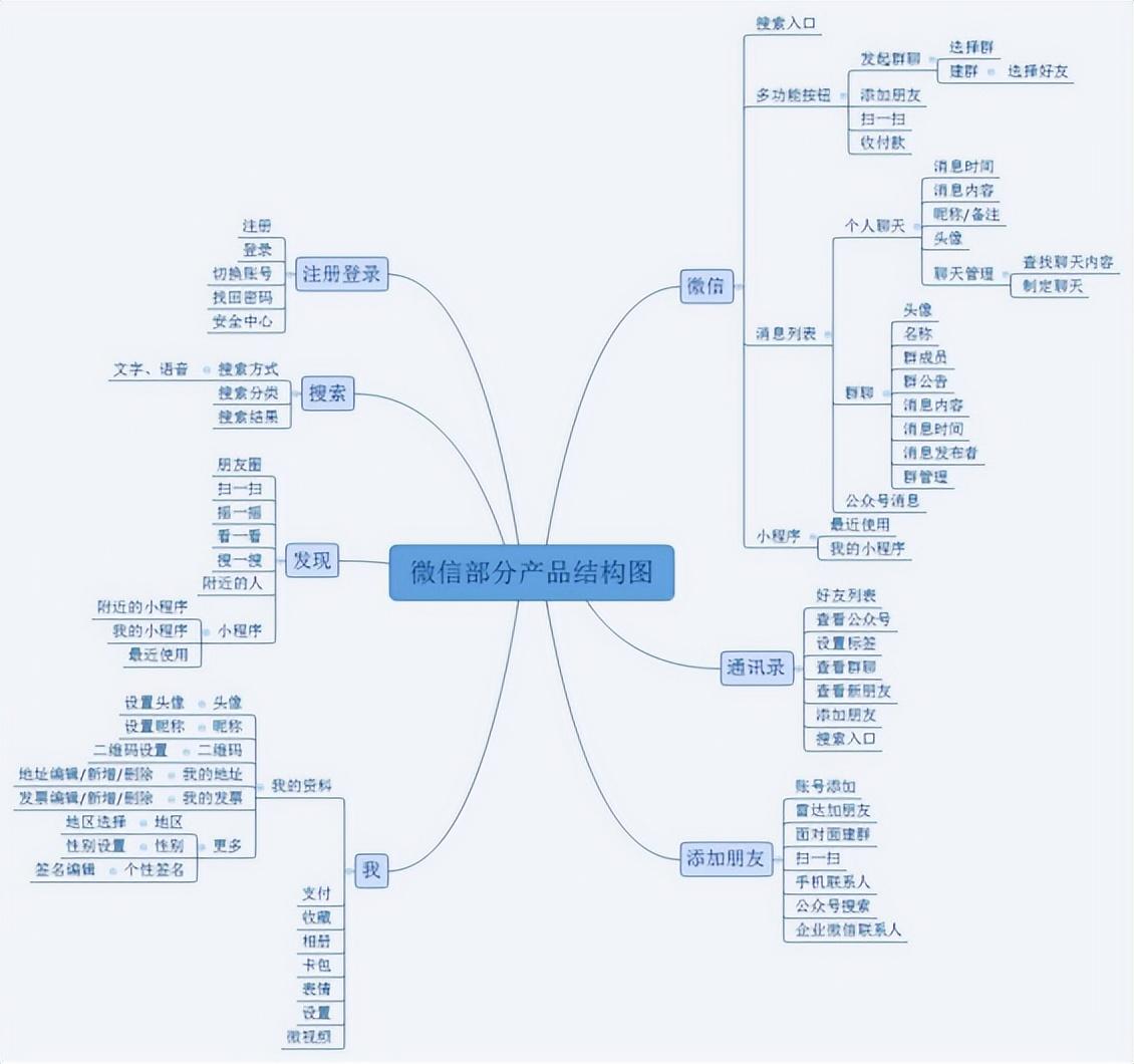 我们先说XMind这款工具软件,这是一款脑图工具,在产品经理的日常工作中主要用来产出结构图,包括但不限于产品结构图、功能结构图、信息结构图。如下图所示: