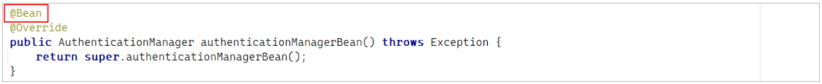 // 配置Spring Security的拦截规则 @Override protected void configure(HttpSecurity http) throws Exception { http .csrf().disable() // 关闭csrf .sessionManagement().sessionCreationPolicy(SessionCreationPolicy.STATELESS) // 指定session的创建策略,不使用session .and() // 再次获取到HttpSecurity对象 .authorizeRequests() // 进行认证请求的配置 .antMatchers(“/user/login”).anonymous() // 对于登录接口,允许匿名访问 .anyRequest().authenticated(); // 除了上面的请求以外所有的请求全部需要认证 }Spring容器注册AuthenticationManager在SpringSecurityConfigurer中重写authenticationManagerBean方法: