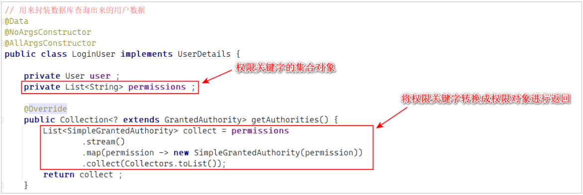 LoginUser接收权限数据,并且对getAuthorities方法进行改造,返回Spring Security所需要的权限对象: