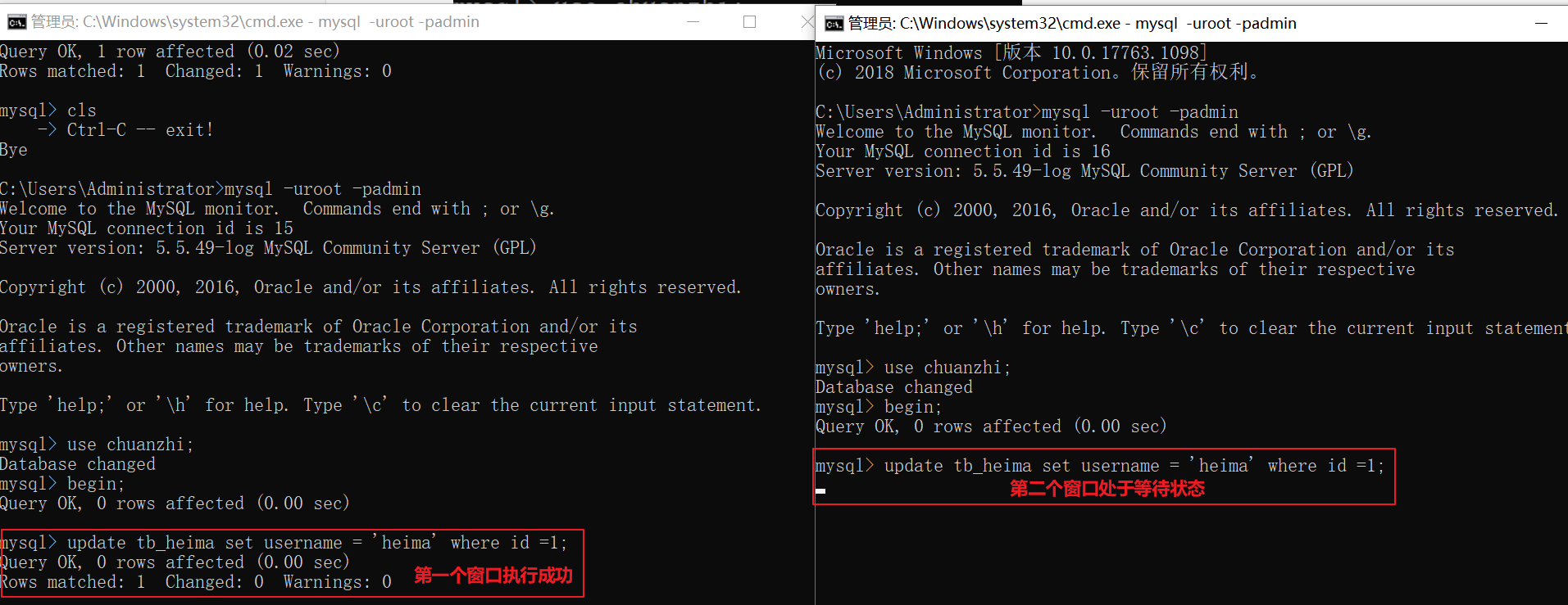 2.2.再打开一个dos窗口登录mysql,开启另一个事务操作同上。再次执行更新语句,mysql> update tb_heima set username = heima where id =1;