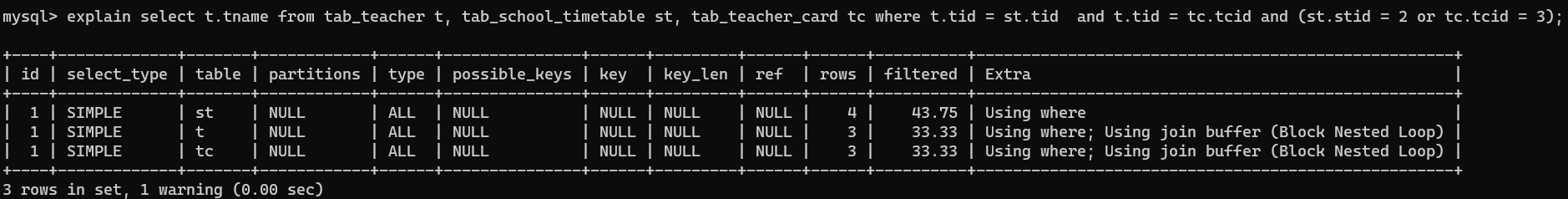 #查询课程编号为2 或 教师证编号为3 的老师信息 explain select t.tname from tab_teacher t, tab_school_timetable st, tab_teacher_card tc where t.tid = st.tid and t.tid = tc.tcid and (st.stid = 2 or tc.tcid = 3);