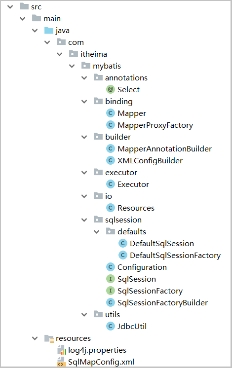 加载类加载目录下的资源文件 Resources.java映射文件解析后信息类 Mapper.java保存配置文件的配置信息 Configuration.java配置文件解析的工具类XMLConfigBuilder.javaSQL语句的执行对象Executor.java获取数据源的工具类JdbcUtil.javaSqlSession接口及实现类SqlSessionFactory接口及实现类SqlSessionFactory的构建者类SqlSessionFactoryBuilder.java动态代理的处理类MapperProxyFactory.java