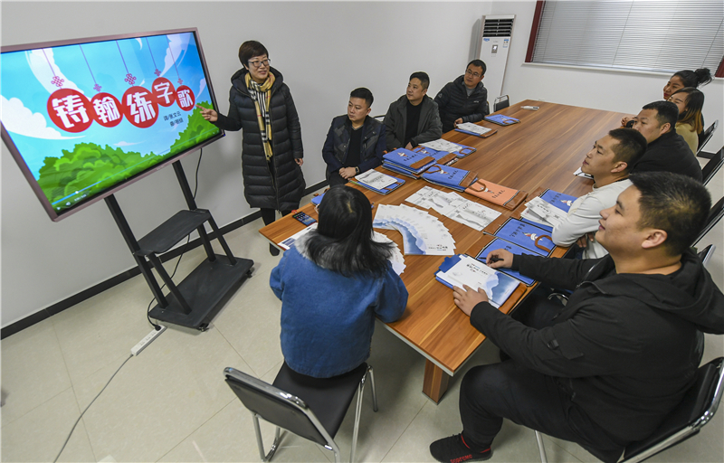 12月18日,在永清县青年众创空间,一名创业者为客户介绍公司研发的汉字书写教学产品。