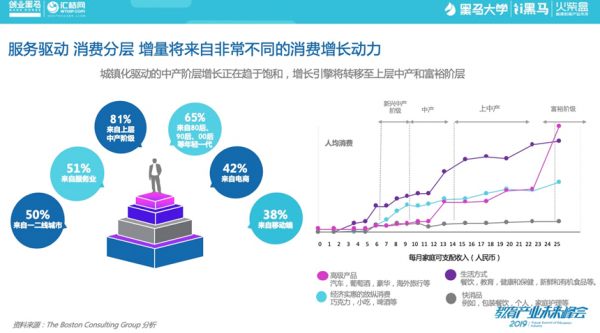同时,我们也可以看到,未来5-10年中,随着城镇化放缓,城市群会成为新的增长驱动力,在城市群中,月收入1.2万-2万的上层中产阶级更加聚集。城市层级在向非一线城市倾斜的同时,年轻消费者将推动69%的消费增长,成为消费增长的主力。孙一丁讲道,以服务为驱动并可以有效改善生活及期许的版块,比如教育,将是未来的核心消费内容 。