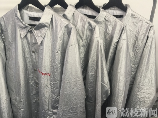 这款银妆式的教练夹克,不仅防水耐脏,摸在手上质感也超好,而它的材质只是杜邦纸。南京林业大学大四学生奇真贤表示,看到这个材料的时候,自己就想将它跟服装结合,来呈现一个新产品,直接穿到身上也是没有问题的,而且在这个设计里面夹一层棉,穿到身上的感觉很不一样。